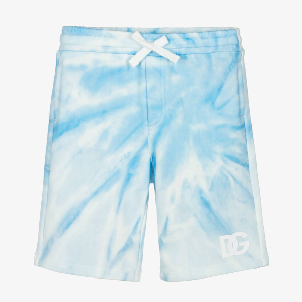 Jersey shorts for little boys from Italian brand Dolce & Gabbana, comfortable in soft blue and white cotton. The fabric is designed in a cool tie-dye effect for a touch of '60s free-spirited style. The luxury label's white Crossover DG logo is stamped just above the front hem for designer recognition.