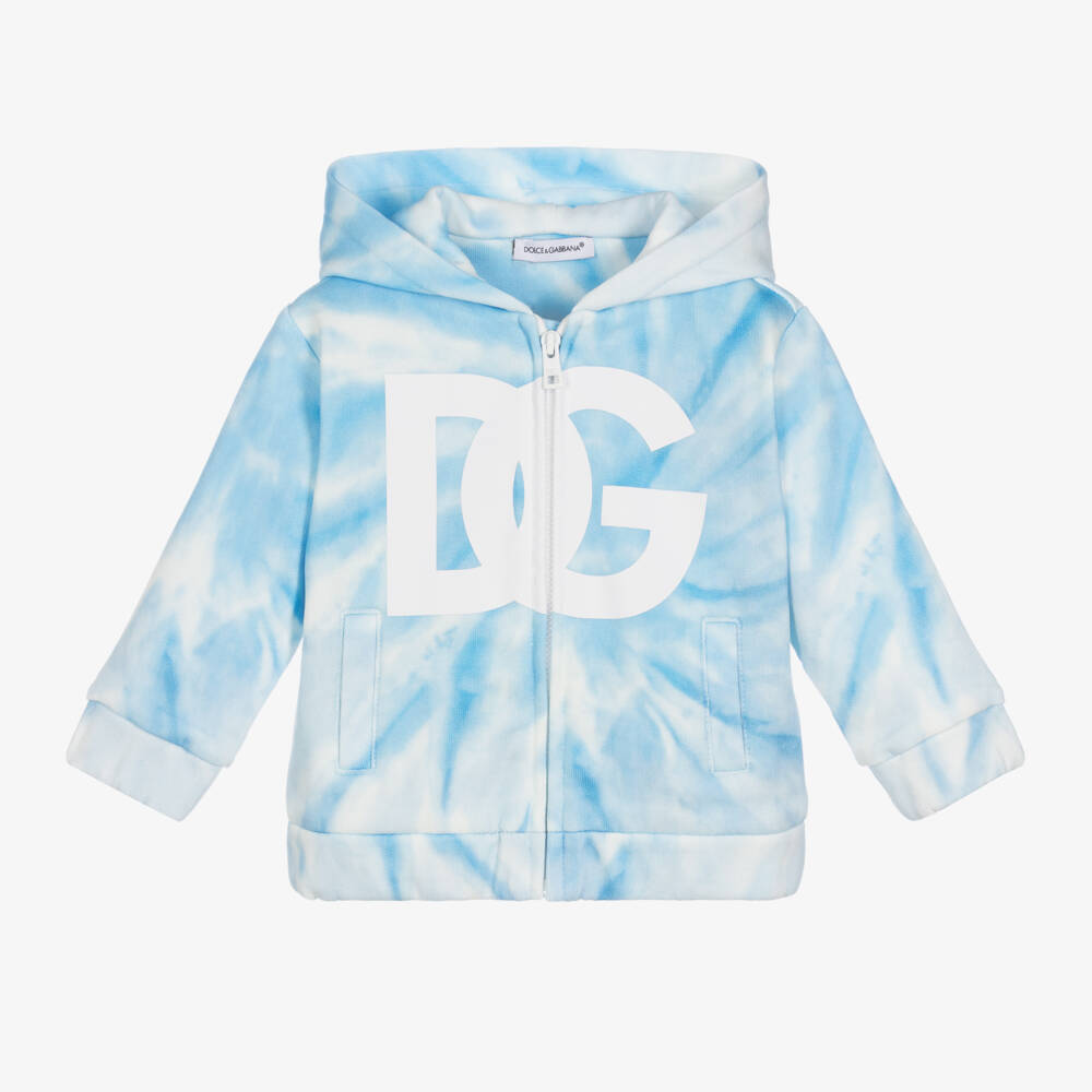 A jersey zip-up top for little boys from Italian label Dolce & Gabbana, comfortable in soft blue and white cotton. This cool hoodie, characterised by its '60s tie-dye-effect print, is sure to stand out with its free-spirited style. A white Crossover DG logo is stamped on the front and the easy-fastening zip is engraved with the luxury brand's name for designer recognition.