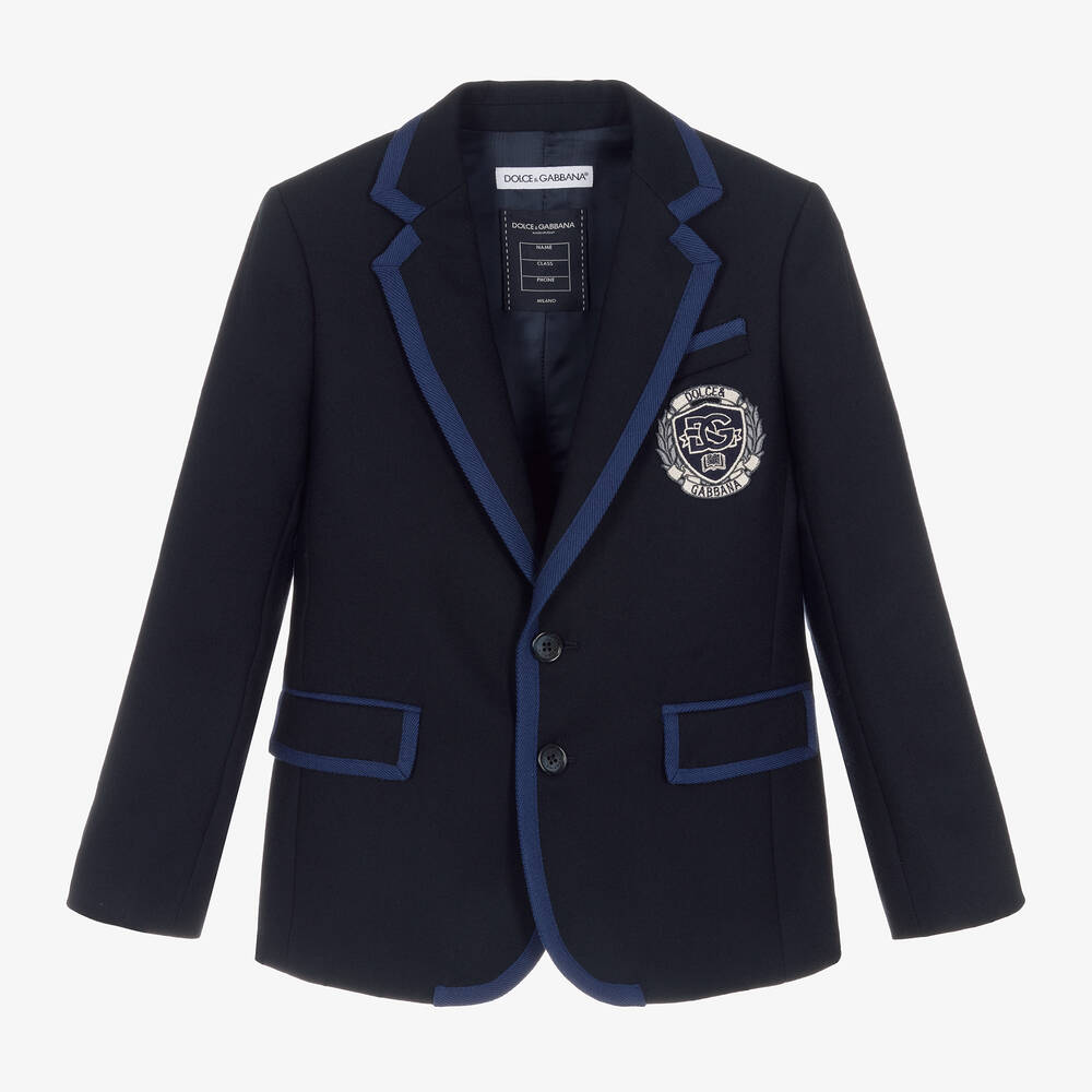 Navy blue blazer for boys by Dolce & Gabbana, the iconic Italian fashion house. Crafted in fine virgin wool, this preppy layering piece epitomises luxurious, smart styling. It has a signature crest logo appliqué on the chest and contrasting blue piping for a reimagined look. All the fine details are considered in this designer item, from the delicately embossed buttons to the lustrous silky lining for ultimate comfort.