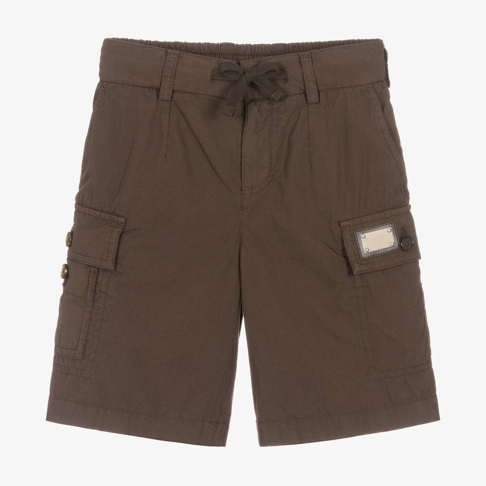 Five-pocket cargo shorts for boys by luxury fashion house Dolce & Gabbana, in deep brown. Designed with a vintage effect, these cool shorts have a silver-hued logo plate on one utility pocket. Zipping up on the front, they fasten with natural buttons on the front and pockets. The lightweight cotton fabric and elasticated, drawstring waist offer all-year-round comfort.