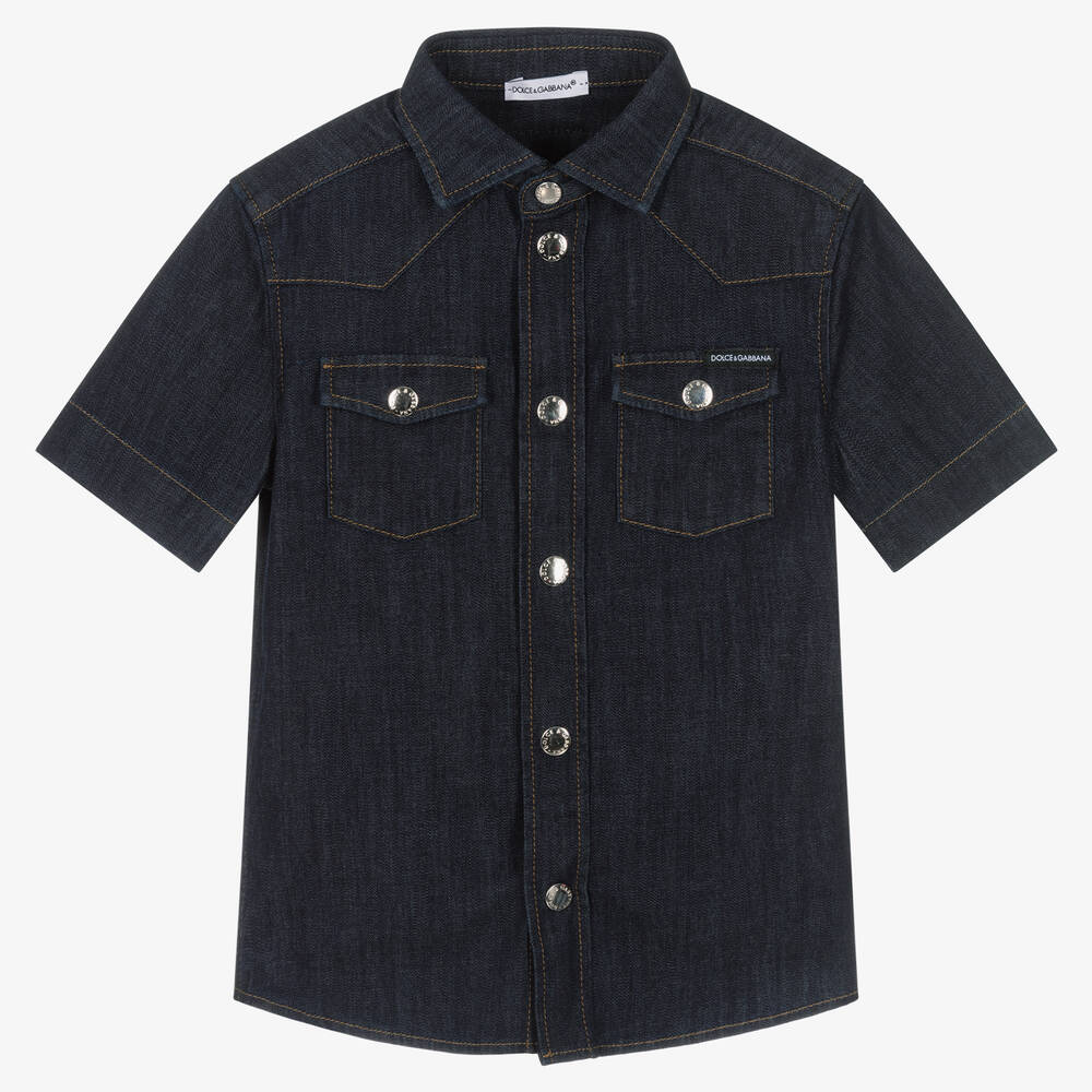 A dark blue shirt for boys by Italian luxury brand Dolce & Gabbana, made from soft denim with a gentle stretch. Trimmed with mustard yellow topstitching, this collared shirt has patch pockets on the chest with pocket flaps and popper fastenings. Signed on the pocket, a black leather and metal logo plaque can also be seen on the back of the neck. Embossed popper fastenings and a curved hem add to the understated design.