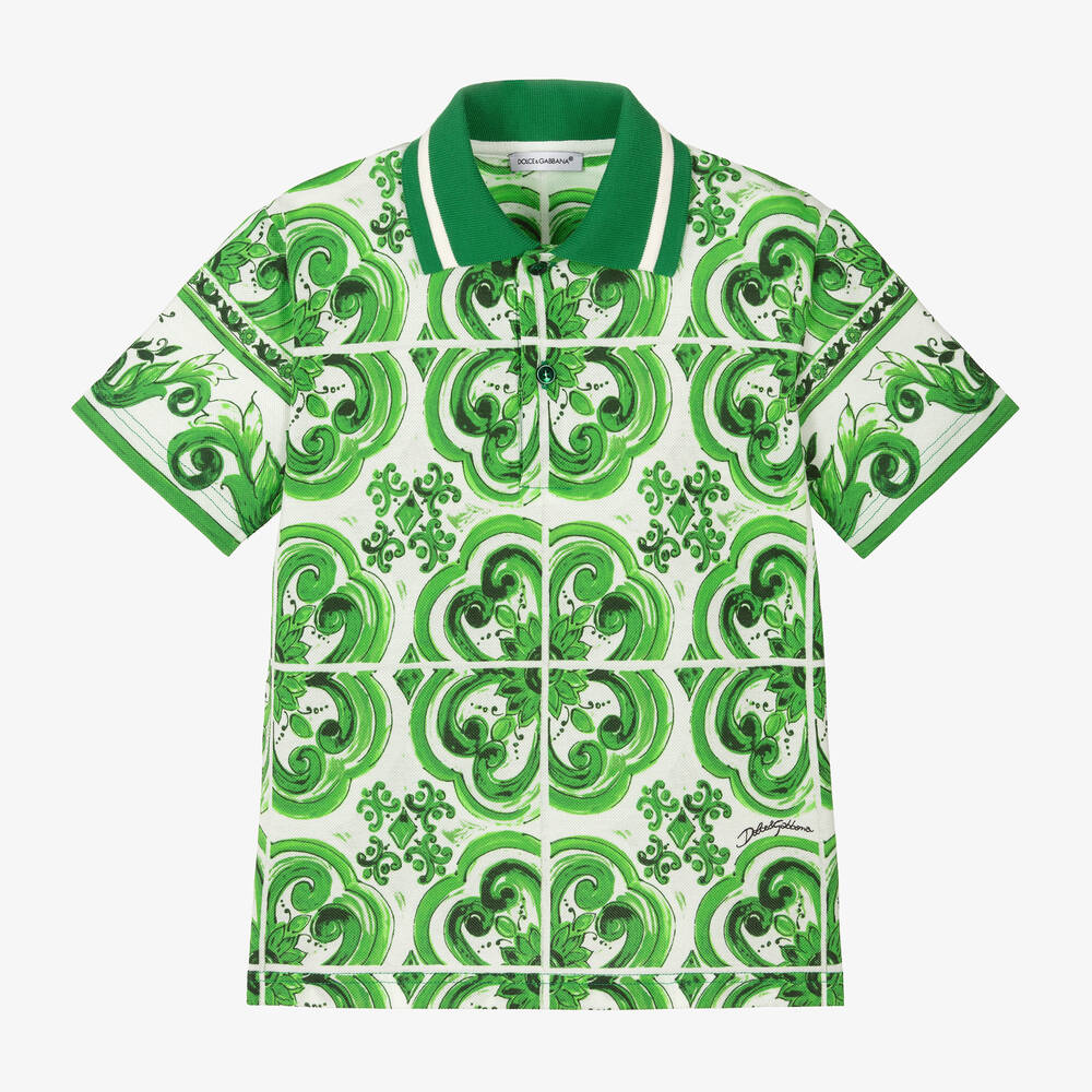 Vibrant green and white cotton polo shirt for boys by luxury Italian brand Dolce & Gabbana, instantly recognisable with its signature Majolica print inspired by Sicilian tiles. Made in soft, comfortable piqué, it has a ribbed green collar, short sleeves, front button fastenings and a black script logo on one side.