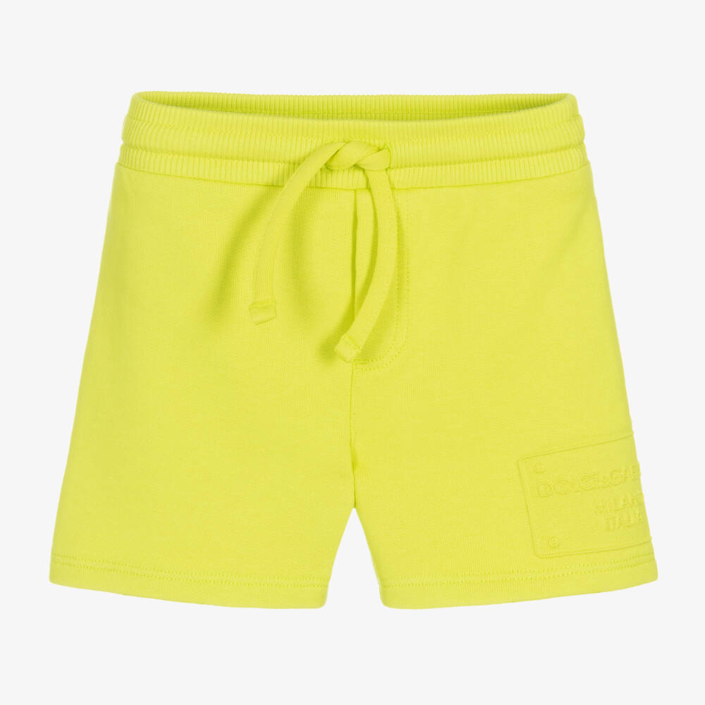 Lime green jersey shorts for little boys from Dolce & Gabbana. Comfortable in soft cotton, they have a drawstring on the gently elasticated waist for an adjustable fit. Embossed on the side is the luxury designer's logo lettering, adding an interesting tactile element to these vibrant shorts.