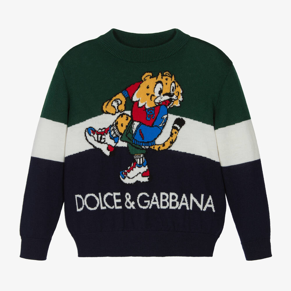 A virgin wool sweater for boys by luxury designer Dolce & Gabbana, designed in green, white and navy blue stripes. A recognisable piece, it has a white intarsia logo design on the front with a symbolic tiger mascot knitted above. The ribbed trims and round neckline ensure a comfortable fit and feel.