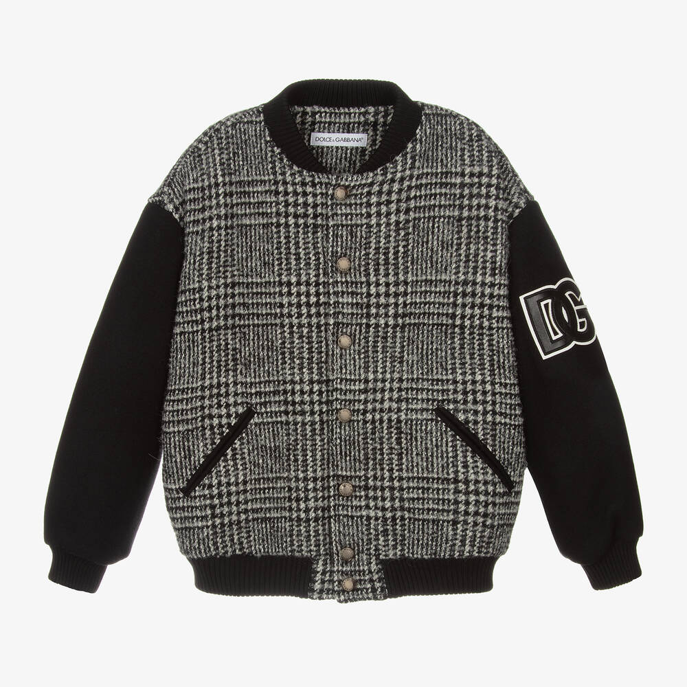 In a stylish grey and black check design, this varsity style jacket for boys is by Italian label Dolce & Gabbana. Made in a luxurious wool blend, it is styled with contrasting black sleeves and ribbed trims on the collar, cuffs and hem. For instant recognition, the brand's name is appliquéd boldly on the back, with the iconic DG logo on one sleeve. Lined in silky satin for ultimate comfort, the stylish look is completed with pockets on the front and silver-tone branded popper fastenings.