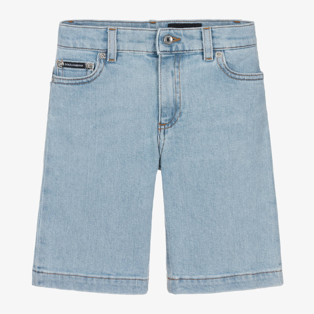Light blue shorts for boys by luxury Italian brand Dolce & Gabbana, made in soft denim with a washed finish. Creating relaxed casual looks, these longer-length shorts feature five pockets with a white crossover DG logo on the back. They have a single button fastening on the front, together with a concealed zip and an adjustable waistband. The cotton fabric has a hint of stretch and contrast topstitching along the seams.
