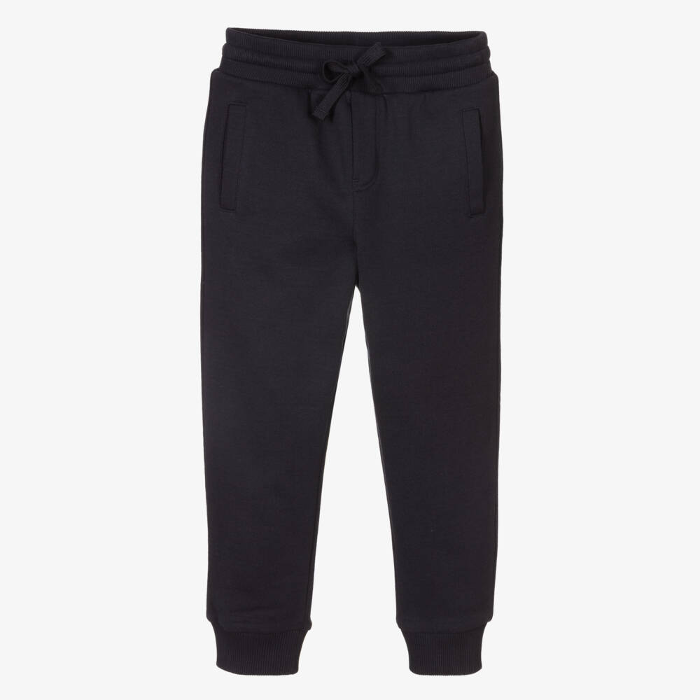 Casual navy blue joggers for boys, by luxury Italian brand Dolce & Gabbana, with a rubberised logo patch on the back pocket. They are made from soft cotton jersey with pockets on the front and an adjustable drawstring on the ribbed waistband.