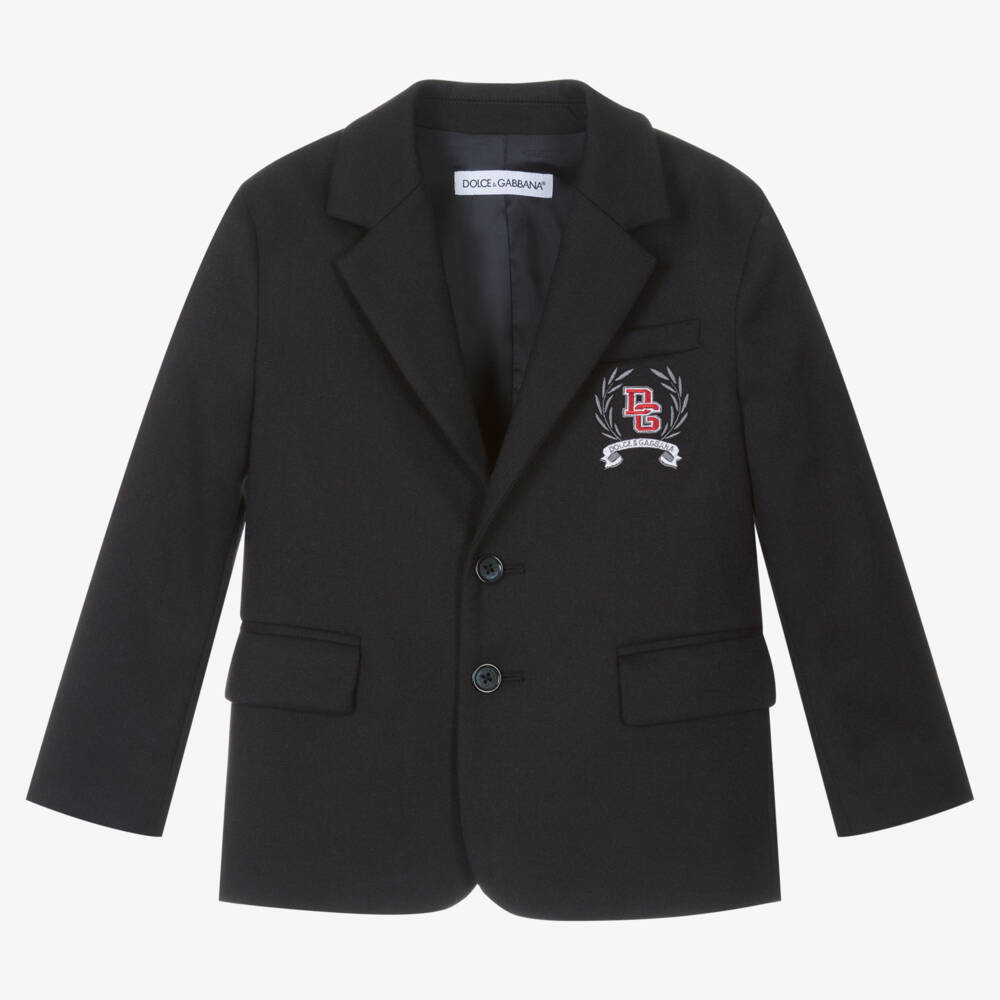 Navy blue single-breasted blazer for boys by luxury Italian brand Dolce & Gabbana, made in beautifully soft, lightweight wool. Fully lined, it has front pockets, a vent on the back and a smart revere collar for classically tailored styling. There are logo-branded button fastenings on the front and button trims on the sleeves. There is a red and grey embroidered crossover DG logo and laurel on the chest pocket for a preppy designer look.