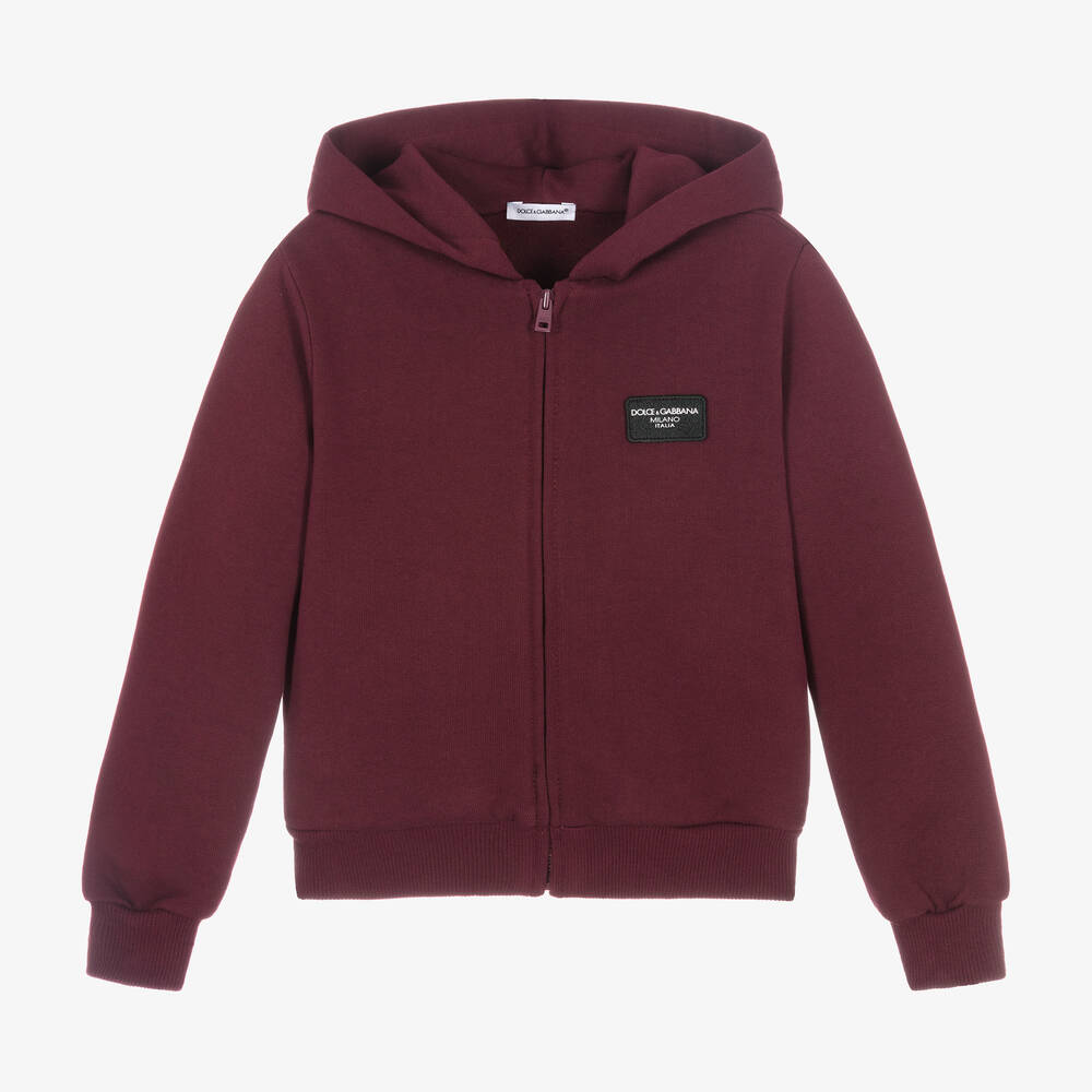Burgundy red hooded zip-up top for boys from luxury fashion house Dolce & Gabbana, made in soft, mid-weight cotton jersey. This cool layering piece has hidden side pockets and a branded zip on the front. The black logo appliqué on the chest completes the look with designer flair.