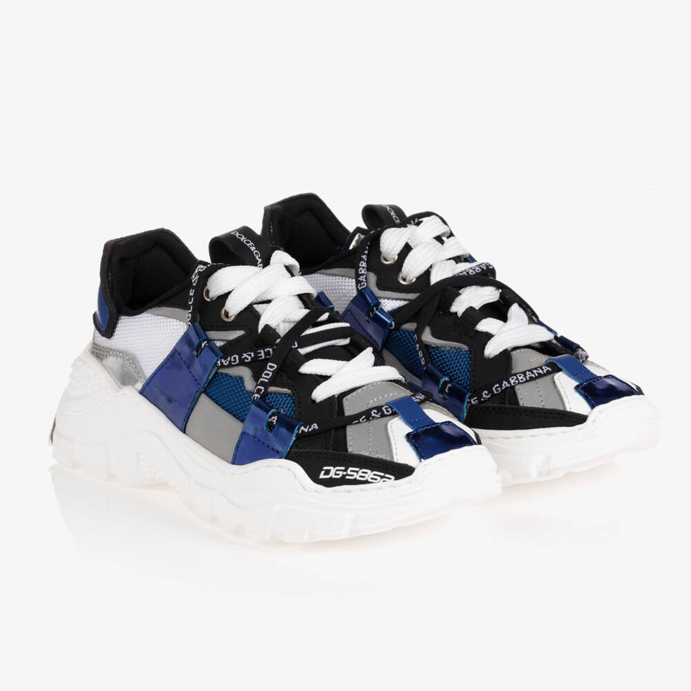 White, black and blue Space trainers for boys by luxury Italian brand Dolce & Gabbana. The upper is made in soft, stretchy mesh, with metallic blue leather trims and light reflective panels. The front has lace fastenings and decorative branded laces. The heel is printed with the designer's logo in white. They have a softly padded leather insole and non-slip rubber sole.