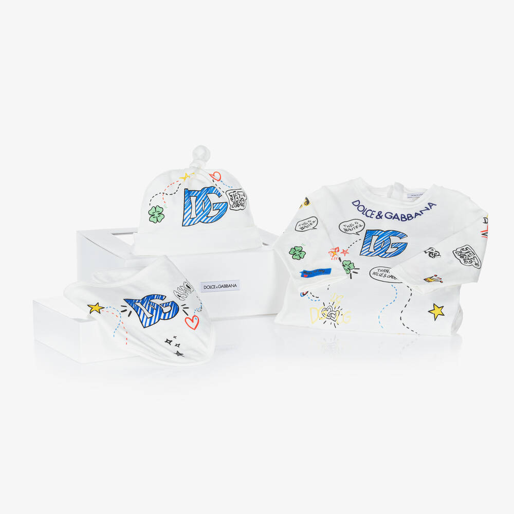 White babygrow, hat and bib gift set for boys by luxury Italian brand Dolce & Gabbana, made in soft, lightweight cotton jersey. All three pieces have bright and colourful graphic prints, featuring fun slogans and the brand's recognisable DG logo. The babygrow fastens with poppers on the back and between the legs. The triangular bib has an absorbent lining and adjustable popper fastenings on the back. Completing the set is a double-layer hat with a turned-up brim and a cute top knot. They are all presented in a beautiful gift box.