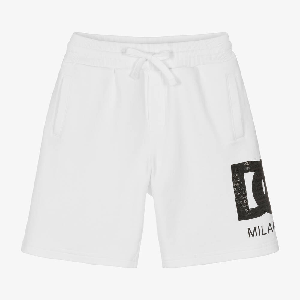 White shorts for boys from luxury Italian fashion house Dolce & Gabbana, made in soft, mid-weight cotton jersey. Ideal for stylish casual wear, they have pockets on both the front and back with a drawstring elasticated waistband ensuring a comfortable fit. The iconic crossover DG logo print can be seen on one leg, highlighted with glossy repeat branding for a distinctive designer look.