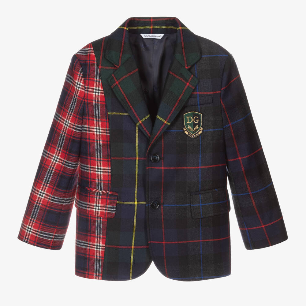 Boys navy blue and red tartan check blazer from luxury designer Dolce & Gabbana. It is made in soft wool twill and lined in silky viscose with a jacquard logo pattern. This beautiful, single-breasted blazer has front button fastening and a gold crest logo appliqué on the chest pocket.