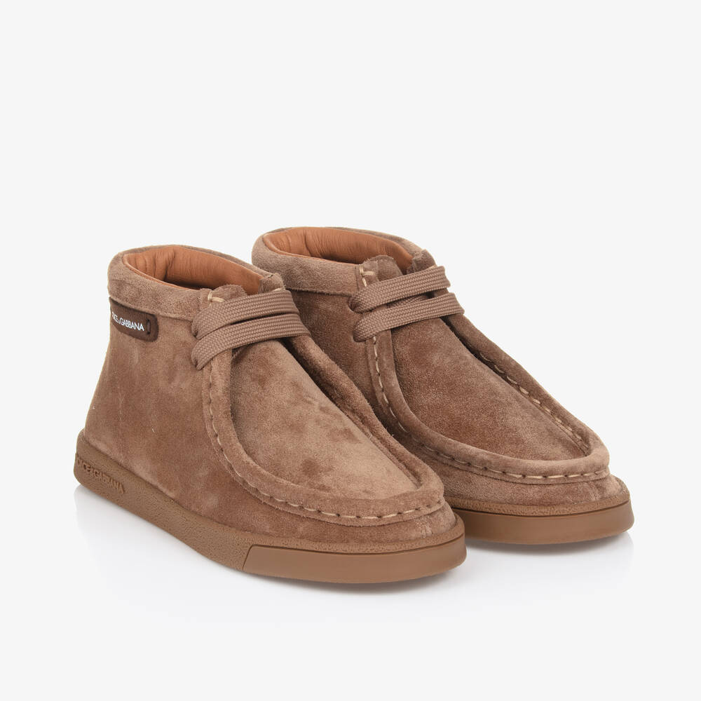 Brown suede leather boots for boys and girls by Dolce & Gabbana, characterised by the luxury brand's logo label. With moccasin-style stitching around the toes, these stylish shoes have tonal lace fastenings on the front. They are lined with soft, breathable leather and designed with the DG logo featuring on the non-slip sole.