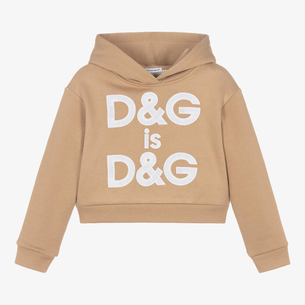 Dark beige jersey hoodie for girls by luxury Italian designer Dolce & Gabbana, made in a soft and mid-weight cotton blend. Designed for a boxy fit, this iconic piece has a bold logo slogan design on the front. The white, embroidered lettering is embellished with transparent rhinestones for a shimmer effect. It has a hooded neckline, lightly ribbed trims, and a fleecy inside for warm and cosy wear.