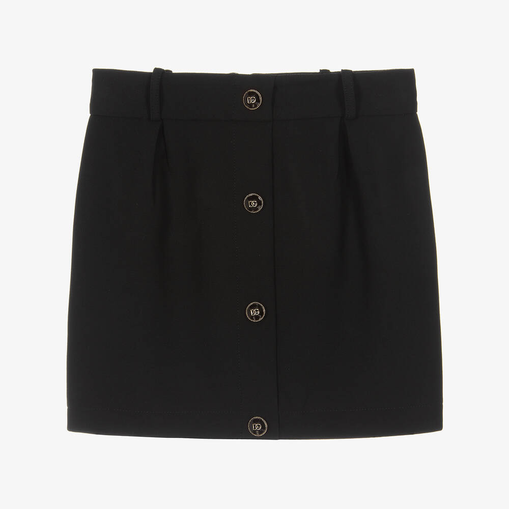 Chic black skirt for older girls by Italian label Dolce & Gabbana. Made in a luxurious viscose blend cady fabric, this smart design has a fitted silhouette and decorative buttons on the front embossed with the brand's DG logo in gold for a distinctive look. It is lined with silky satin for comfortable wear, with a concealed zip fastening on the back and an adjustable waistband ensuring an ideal fit.