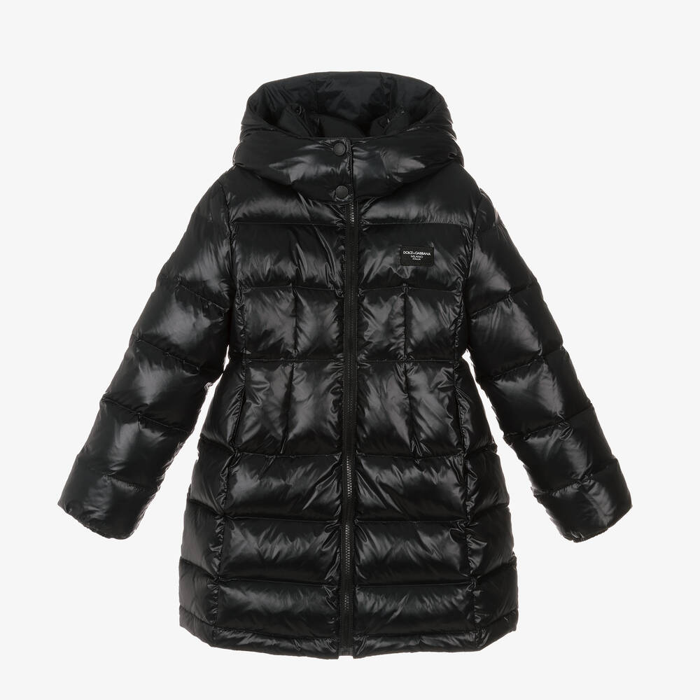 Black puffer coat for girls by luxury label Dolce & Gabbana, with a practical, detachable hood. Lovely for those cooler months, this warmly padded coat is made in a silky fabric with a gorgeous sheen. It has useful pockets on the front and for that signature look, the Italian brand's logo patch can be seen on the chest. Elasticated cuffs, a high collar and a smooth zip fastening complete the stylish look.