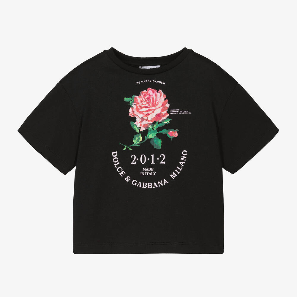 Black cotton T-shirt for girls by Dolce & Gabbana, made in soft cotton jersey. For instant designer appeal, the luxury Italian label's pink logo can be seen on the front, together with 'DG Happy Garden' motifs and a romantic pink rose with glitter accents. Styled with a ribbed crew neck and short sleeves, it has a comfortable relaxed fit.