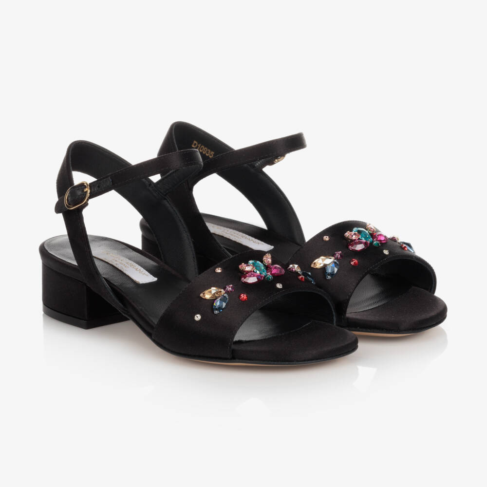 Girls black heeled sandals by luxury brand, Dolce & Gabbana. Beautifully made in silk and viscose, these special occasion shoes have sparkly coloured gems decorating the foot strap. They fasten around the ankle with a delicate buckle strap. They have a leather inner sole and a 3cm high block heel.