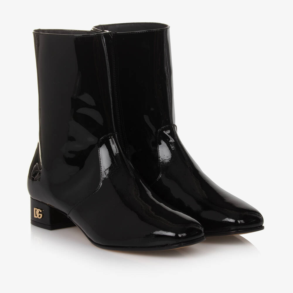 Stunning black patent leather boots for girls by luxury Italian fashion house, Dolce & Gabbana. Beautifully glossy with a square toe, they have a chic ankle length design and elevated heel, decorated with a gold crossover DG logo. The insoles and lining are made using supple leather for luxe comfort. They fasten with subtle zips on the inside of the foot for an easy yet stylish fit.