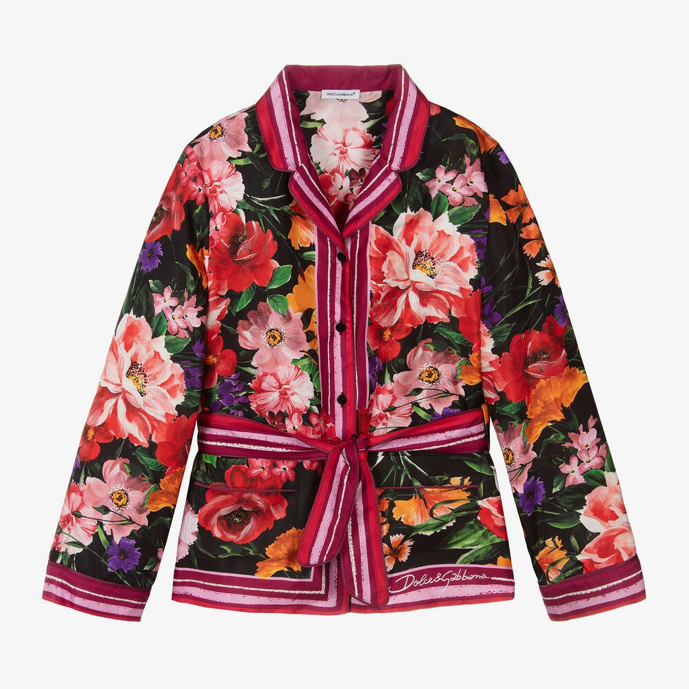 A gorgeous silk blouse for girls by luxury Italian label Dolce & Gabbana, with a vibrant pink and yellow floral print against a black background. Made in soft twill with an elegant drape and branded buttons, this longer-length style has a Cuban collar, front patch pockets and a matching silk belt to cinch the waist. The edges are trimmed with pink and purple stripes and a white script logo above the hem adds a designer touch. A versatile top, it can also be worn as a beautiful, lightweight jacket.