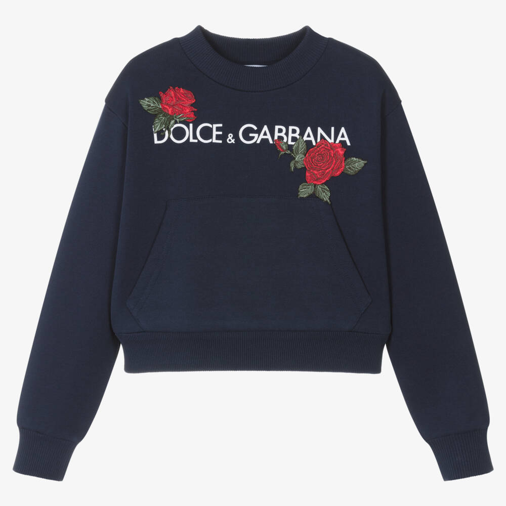 A navy blue sweatshirt for girls by luxury Italian brand Dolce & Gabbana, made from soft cotton jersey. This stylish boxy fitting top has a bold white logo print with embroidered rose appliqués for a pretty look. It has ribbed trims and a pouch pocket on the front.