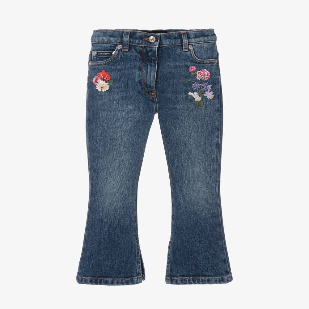 In a mid-blue wash, these denim jeans for girls are by Italian fashion house Dolce & Gabbana. Intricately embroidered floral appliqués add a romantic feel to these cotton flares. Luxuriously soft with added stretch for comfort, they are vented on the hem for freer movement. Full of designer appeal, they have a branded silver-tone button and rivets, a label on the pocket, and a golden logo plate on the back. With five pockets, they have an adjustable waist for the ideal fit and an easy-to-use front zip.