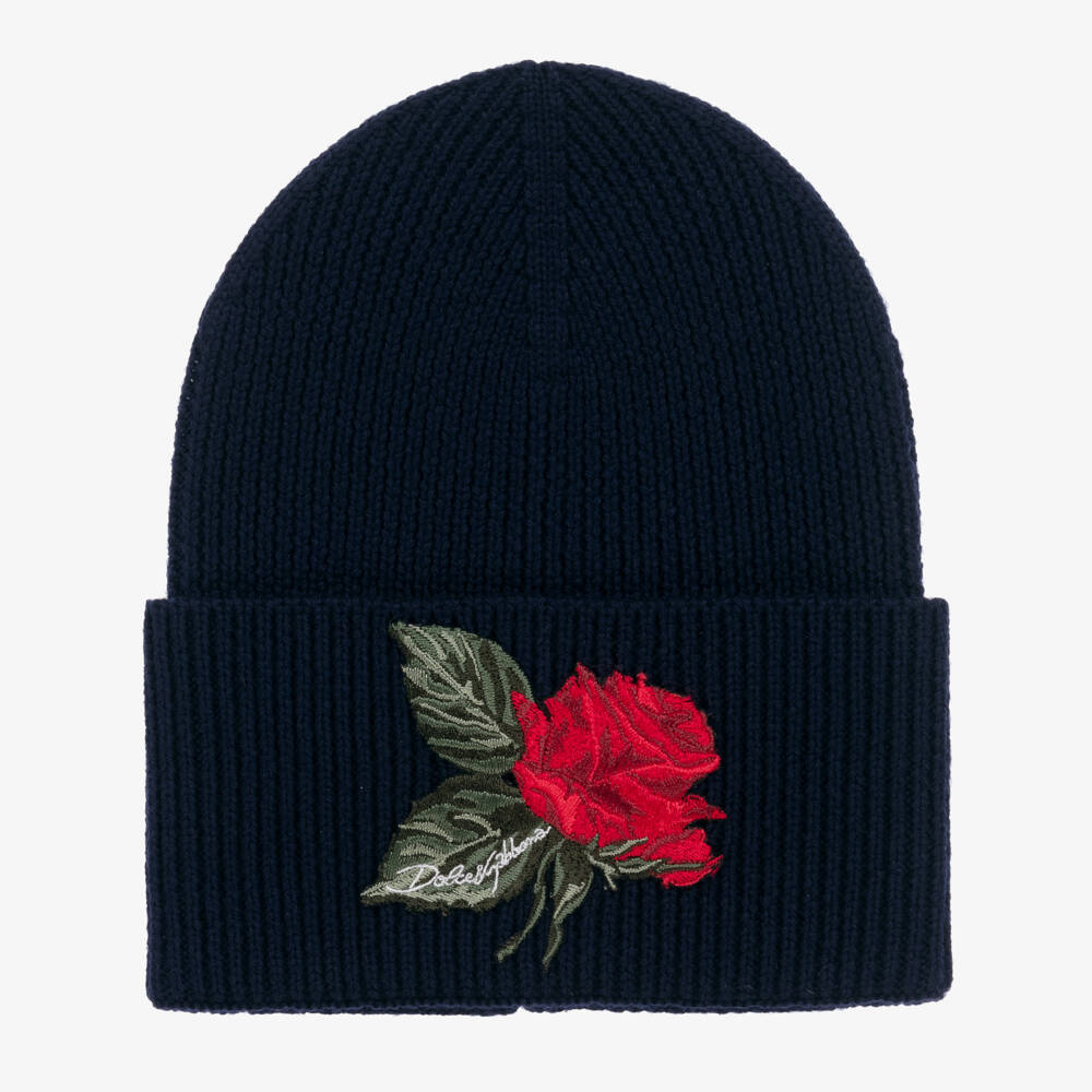 A navy blue beanie for girls by Italian fashion house Dolce & Gabbana, knitted in luxuriously soft and cosy wool. Standing out on the folded front is a red embroidered rose signed with the signature crossover DG logo.