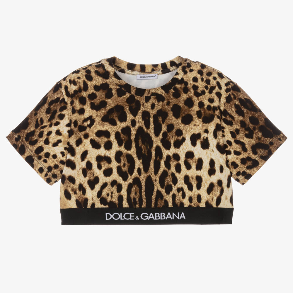 Inspired by the women's collection, this cropped top for girls by Dolce & Gabbana, in the designer's signature brown, black, and beige leopard print. It features a black elasticated trim with a white jacquard logo on the front, adding a sporty vibe and designer element to this casual piece. It is made in luxury soft cotton jersey for comfort.