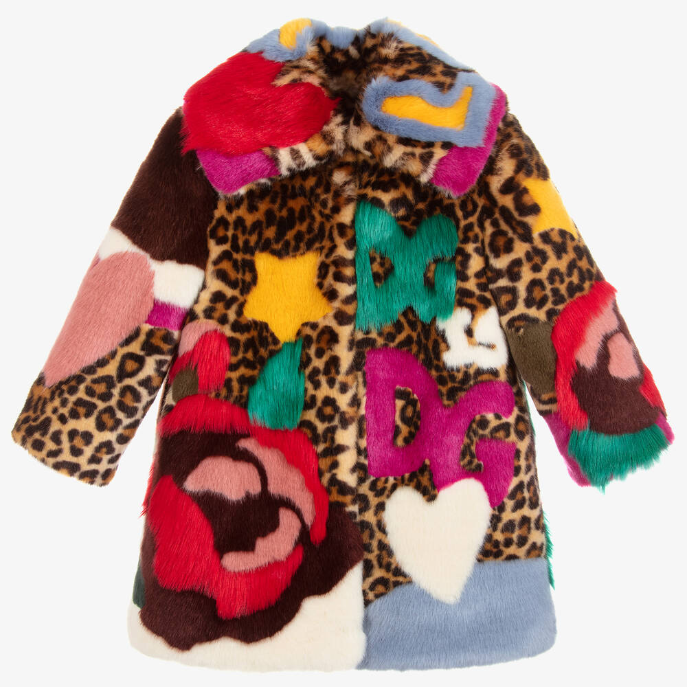 Girls multicolour luxury faux fur coat from Dolce & Gabbana. This stunning design has a colourful patchwork of different patterned fabrics, with the designers' logo lettering and 'Love' printed within the fabric.