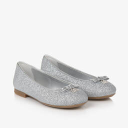Glittery silver ballerina pumps for girls by luxury label Dolce & Gabbana. Lovely for those special occasions, these elegant pumps are trimmed on the front with a dainty bow and silver metal DG logo. Made and lined in fine leather, they have a lightly cushioned insole for lasting comfort and a rubberised, non-slip outer sole for improved grip.