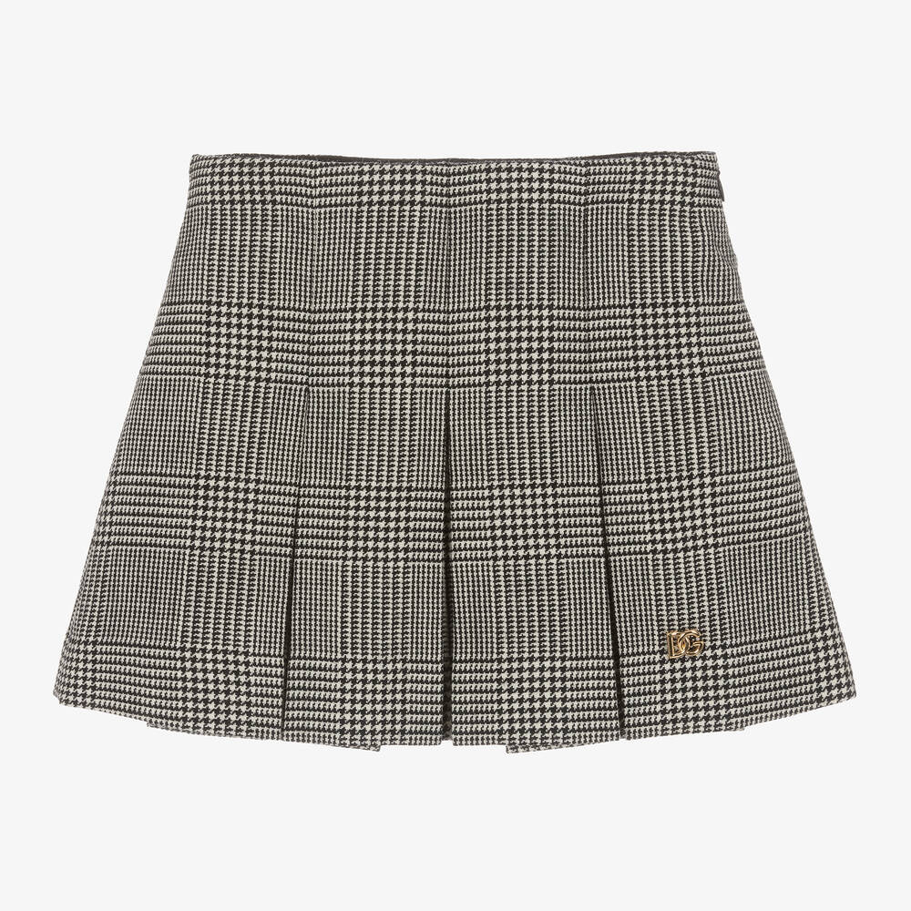 Girls black houndstooth skirt by luxury Italian fashion house, Dolce & Gabbana. Finely woven in exquisite virgin wool, this preppy style is pleated, simple and stylish. The beautifully soft and silky viscose lining offers uncompromised comfort, and it fastens with a smooth, concealed zip on the side . A shiny gold crossover DG logo appliqué sits on the hem, signing off the look with instant designer appeal.