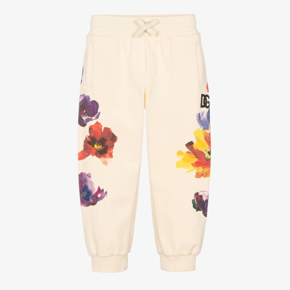 Dark ivory joggers for girls by luxury Italian designer Dolce & Gabbana, made in soft, mid-weight cotton jersey. Adding a feminine touch to relaxed casual wear, they are patterned on the legs with stunning painted flowers in rich red and purple shades, capturing the spirit of the 1960s. The signature crossover DG logo is printed in black on one side for a distinctive branded touch. They are complete with side pockets, cuffed ankles and a stretchy, ribbed waistband with a drawstring tie for a comfortable fit.