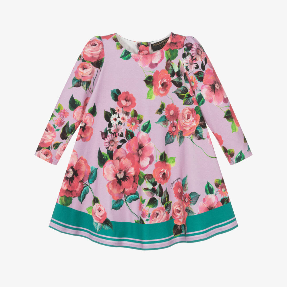 Beautifully combining style and comfort for baby girls, this lilac dress is from luxury Italian label, Dolce & Gabbana. Made in soft cotton jersey, this simple A-line design is patterned with flowers in shades of pink and green and trimmed with green stripes around the hem. It fastens with a concealed zip on the back and comes with a pair of matching knickers.