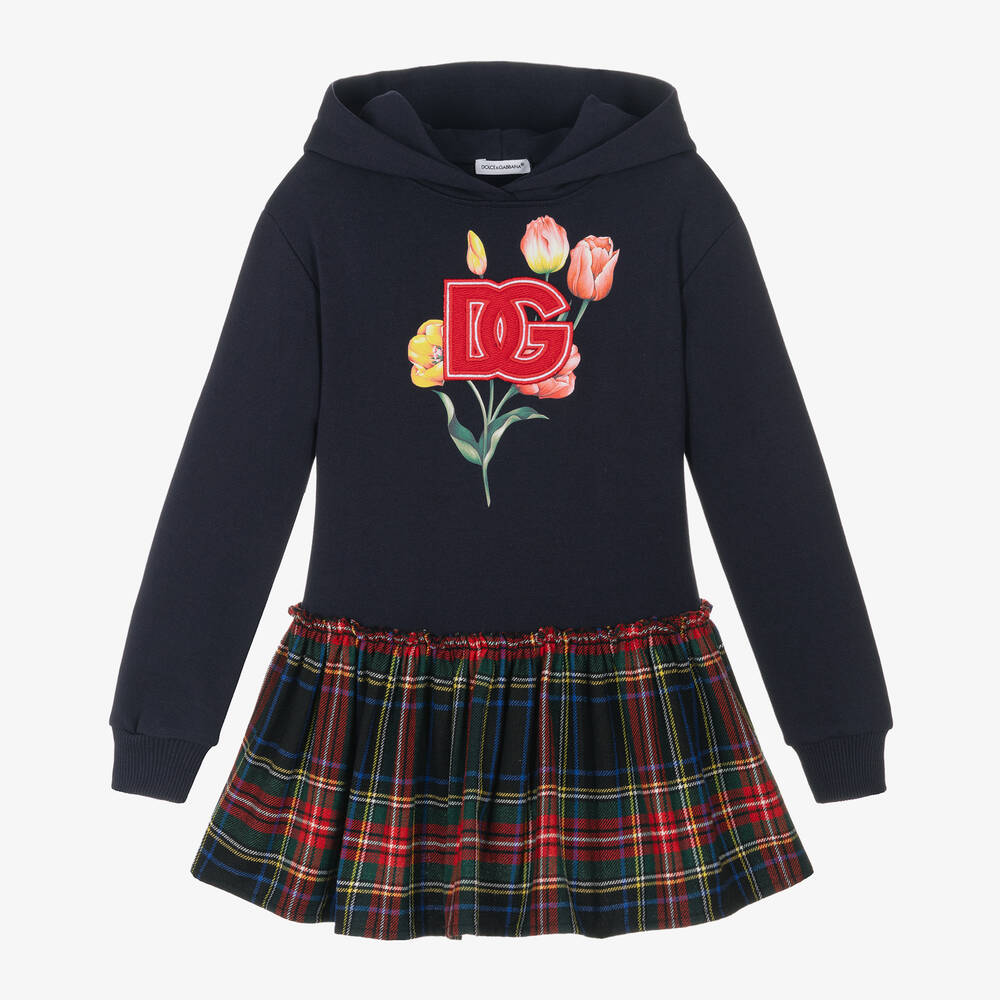 Navy blue hooded sweatshirt dress for girls by luxury Italian brand Dolce & Gabbana, made in a mid-weight cotton and wool blend. Warm and cosy, this casual dress has a dropped waist with a red and green tartan skirt. The long sleeves have ribbed cuffs and there is a pink and yellow tulip design printed on the front. For a bright and bold designer finish there is a large red and white DG logo embroidered on the front.