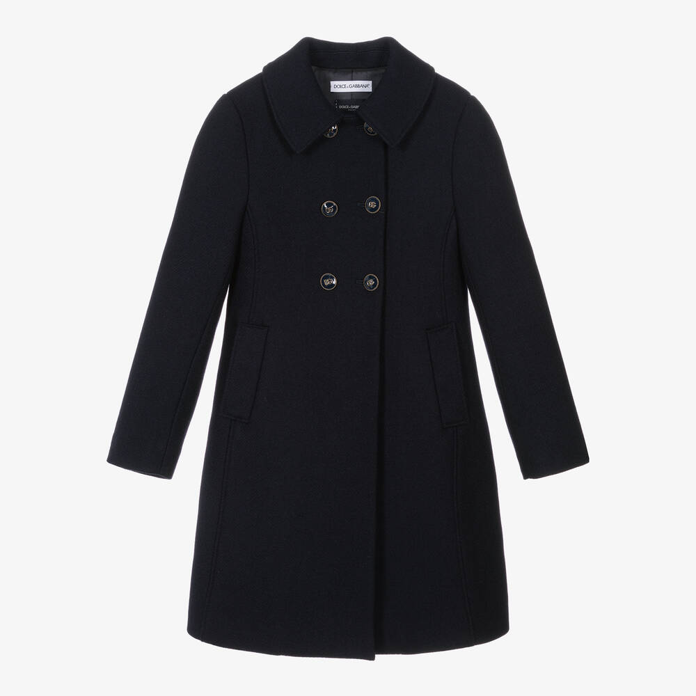 Lovely navy blue coat for girls by luxury Italian brand Dolce & Gabbana, made in soft, mid-weight wool. Lightly padded for extra warmth, this traditionally styled double breasted coat is fully lined for comfort. It has a smart collar, front pockets and a vent on the back for ease of movement. There are shiny blue and bronze logo buttons on the front and cuffs for a subtle designer finish.