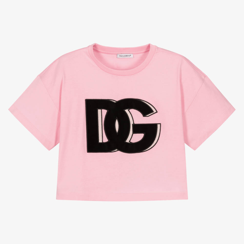 Blossom pink T-shirt for girls by Italian luxury brand Dolce & Gabbana, made from soft cotton jersey. In a boxy shape, it has a crossover DG logo appliqué on the chest, made to look three-dimensional with a black velvet front, an embroidered black outline and a light pink layer behind. It is designed with a ribbed crew neck and dropped shoulders, creating a cool and casual look.