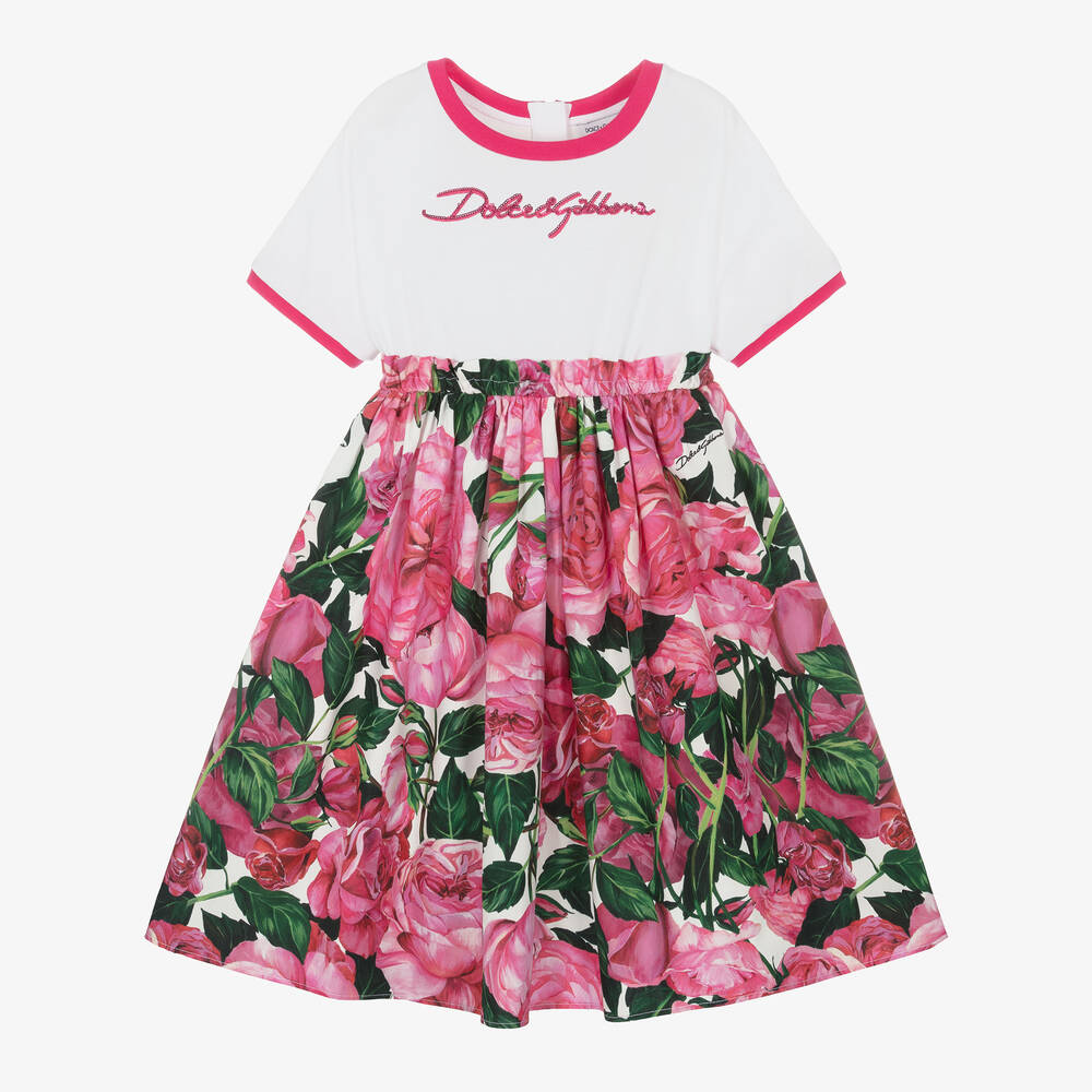 Gorgeous pink and white floral cotton dress for girls by luxury Italian designer Dolce & Gabbana. The comfortable white jersey bodice has pink, ribbed trims and a shimmering pink sequinned logo across the front. The full, gathered, poplin skirt is patterned with beautiful rose blooms in pink and green, interspersed with subtle black logos. It has a pretty, frilled waist and fastens with a neat, concealed zip on the back.