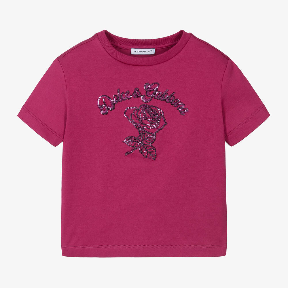 Sparkling with sequins, this gorgeous T-shirt for girls by Dolce & Gabbana is in a beautiful magenta-pink shade. The sequin motif features a rose with the luxury Italian brand's logo above for instant designer appeal. Soft and easy to wear, this crew neck tee is made in comfortable cotton jersey.
