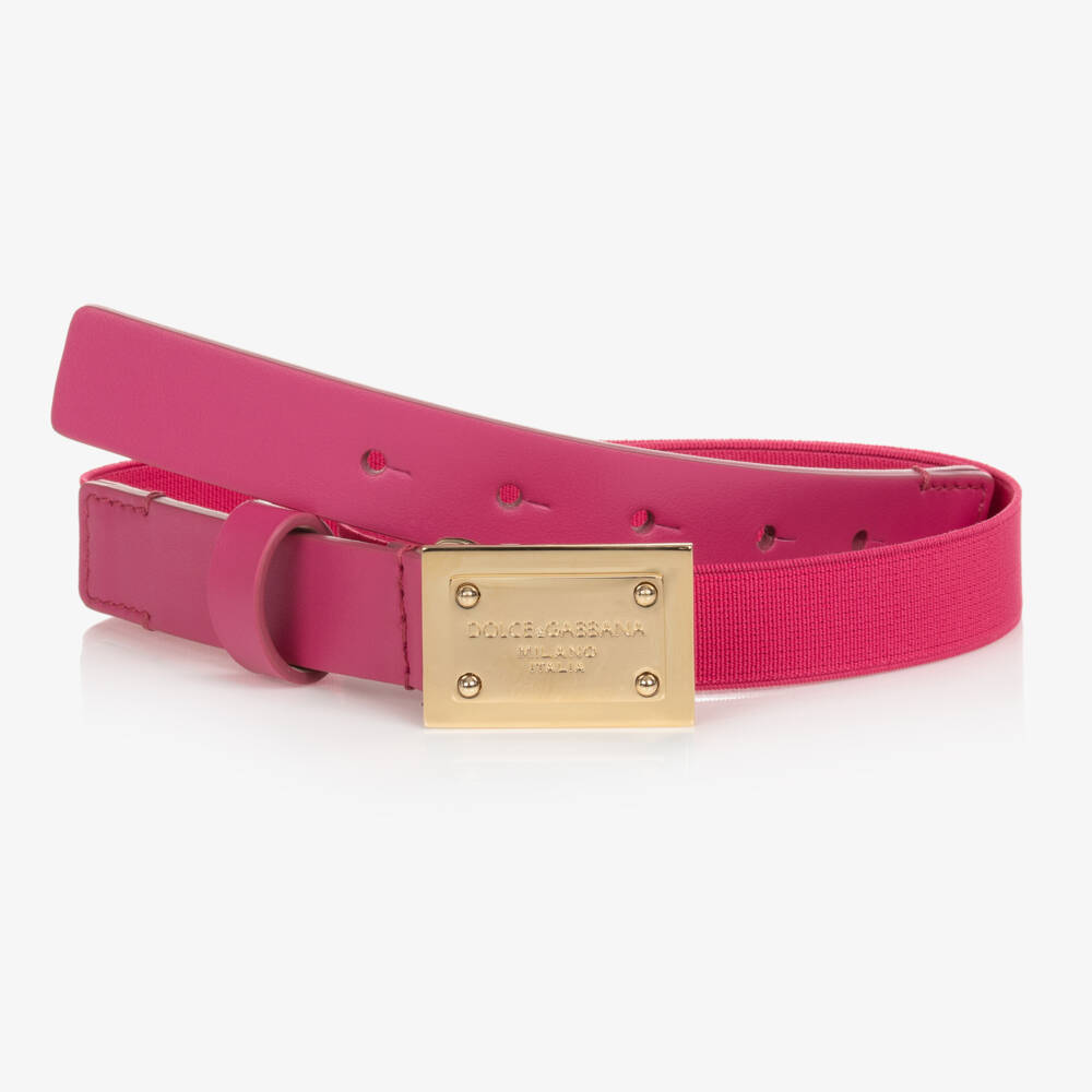 This fuchsia pink Italian-made belt for girls is designed by Dolce & Gabbana. The front fastening is crafted in soft leather with the label's luxe golden metal logo plate as a pin buckle. The belt is made in stretchy elastic for a comfortable fit on little tummies.