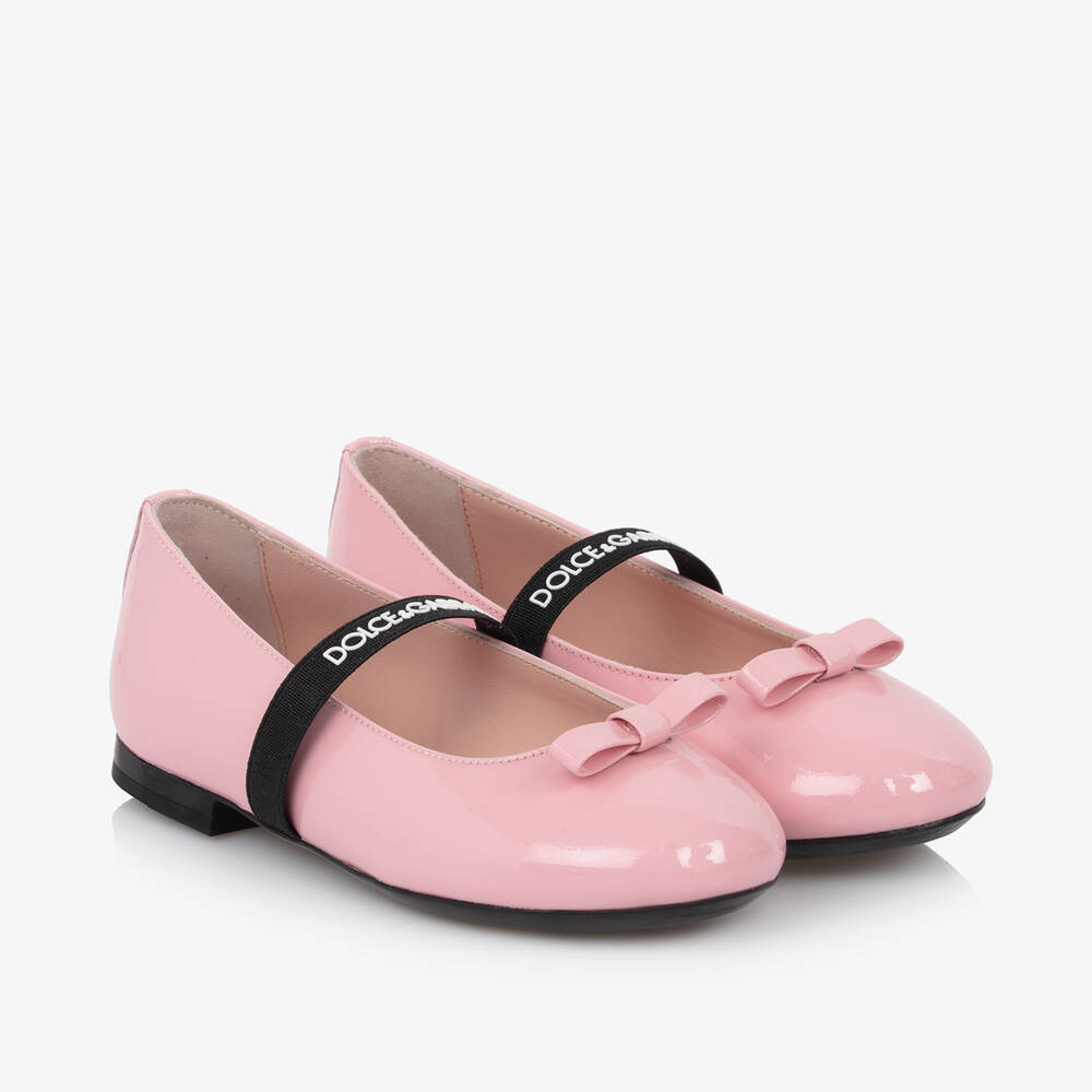 Chic, glossy pale pink patent leather ballerina flats for girls by luxury designer Dolce & Gabbana. For a smart casual styling, they have black elasticated straps with a white rubberised logo, adding a modern look and keeping the foot in place comfortably. This classic slip-on design has a pretty bow, a full leather lining and a lightly padded insole with lovely perforated detailing for a more refined finishing touch. The rubber outsole improves grip when walking.