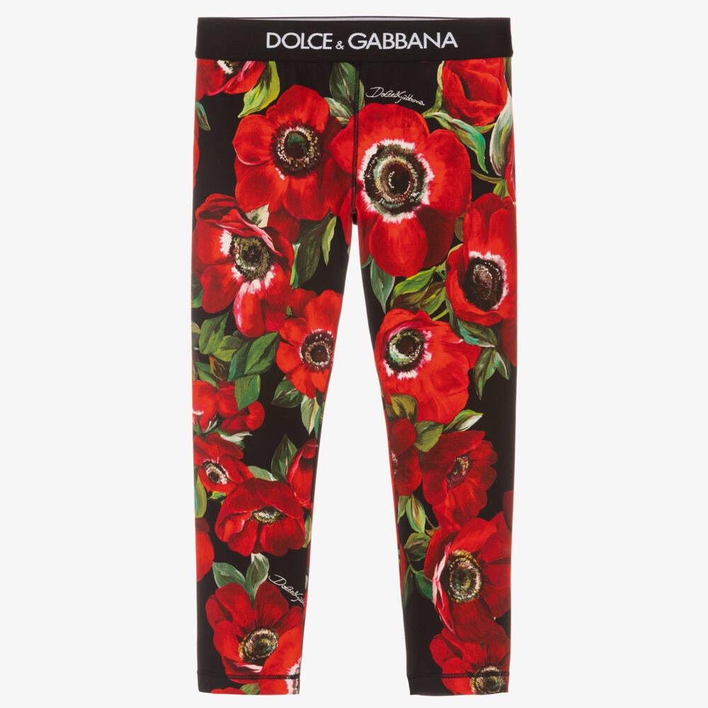 Mini-me leggings for girls by luxury Italian designer Dolce & Gabbana, with a red poppy and logo print on a black background. Full length, they are made in comfortable cotton jersey with a black and white elasticated logo waistband.