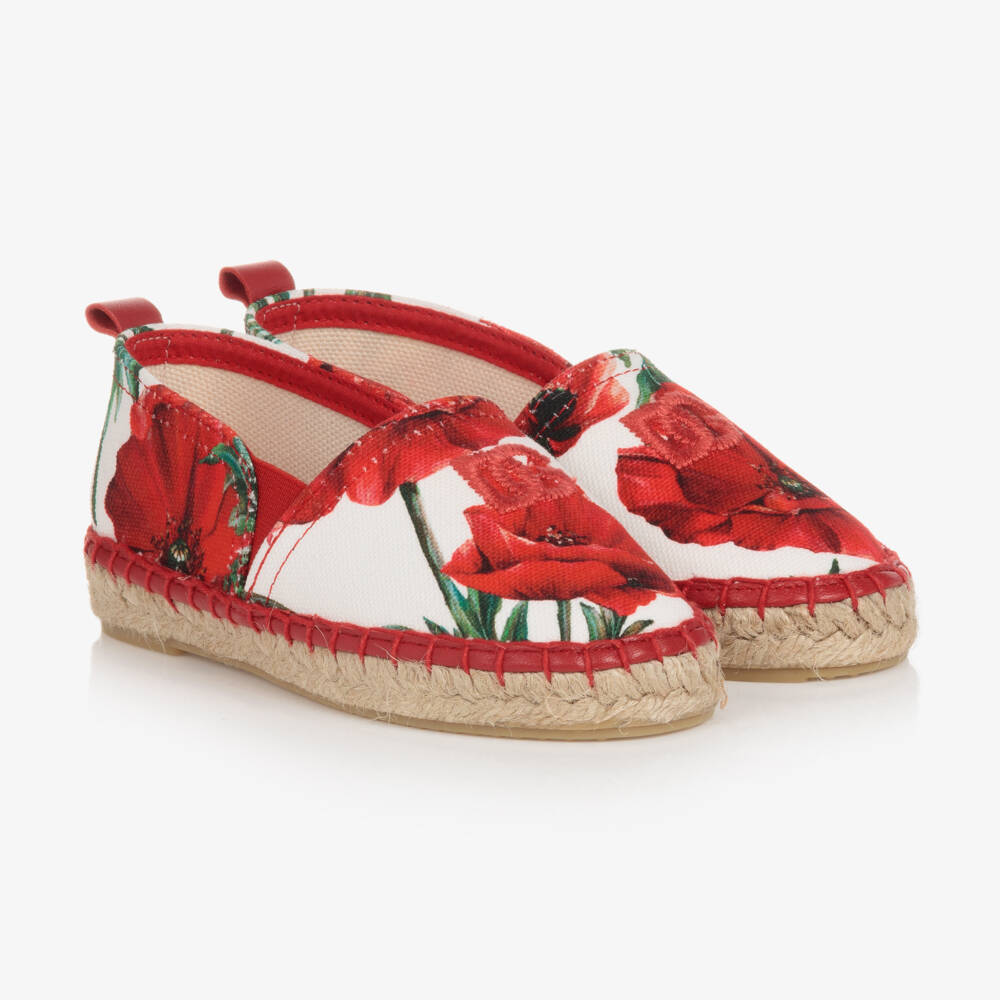 A luxurious pair of white canvas espadrilles for girls, by Italian brand Dolce & Gabbana. Exuding in sophistication, they are patterned in the designer's signature red and green poppy design, with an embroidered crossover DG logo. The elasticated sides ensure the shoe slips on effortlessly, whilst the softly padded leather lining offers comfort. They are beautifully finished with jute midsoles, and have a non-slip rubber outsole.