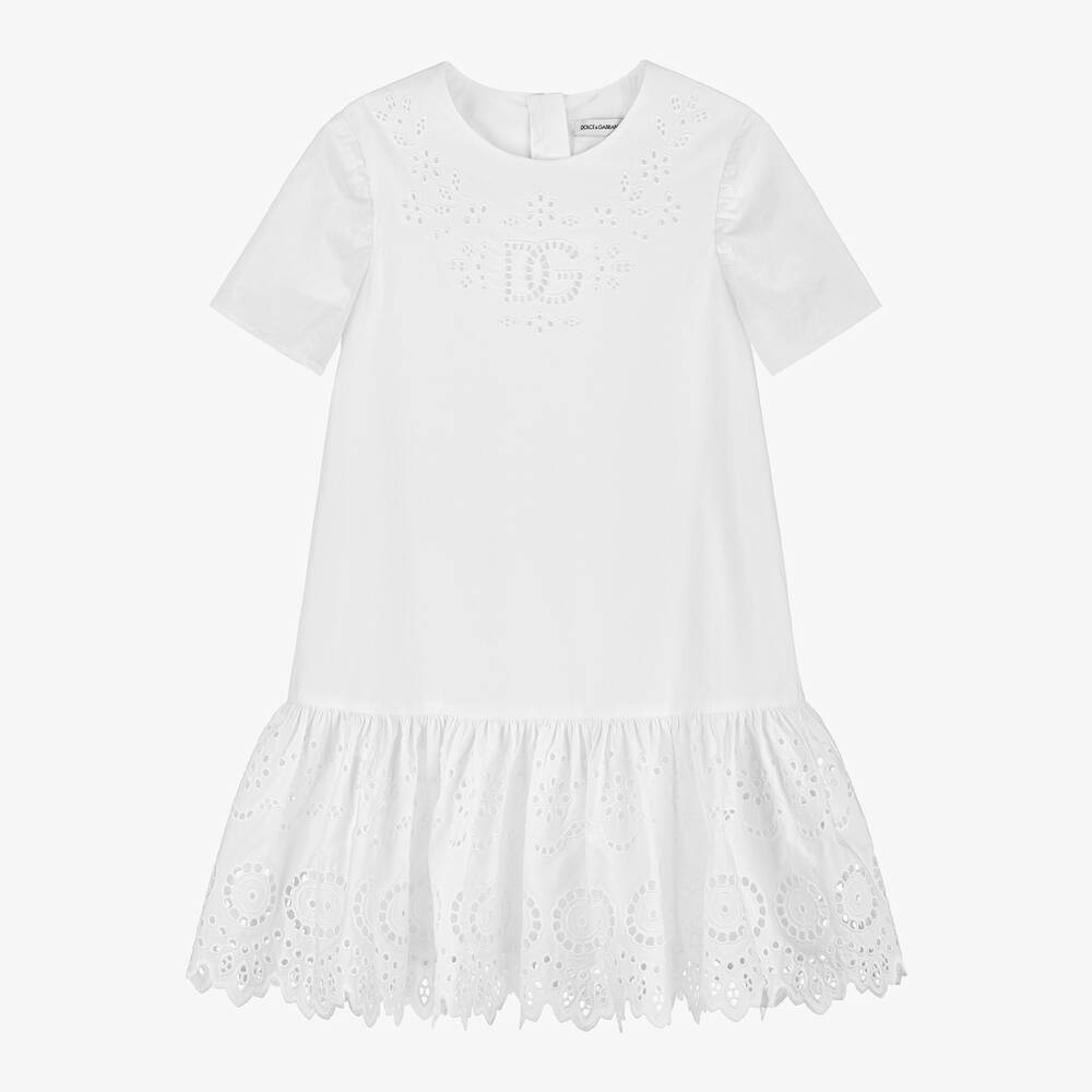 A white cotton dress for girls by luxury designer Dolce & Gabbana, made and lined in lightweight poplin. The bodice and dropped-waist ruffle hem, decorated beautifully with broderie anglaise, add elegant features to this pretty dress. It fastens neatly with a hidden zip on the back.