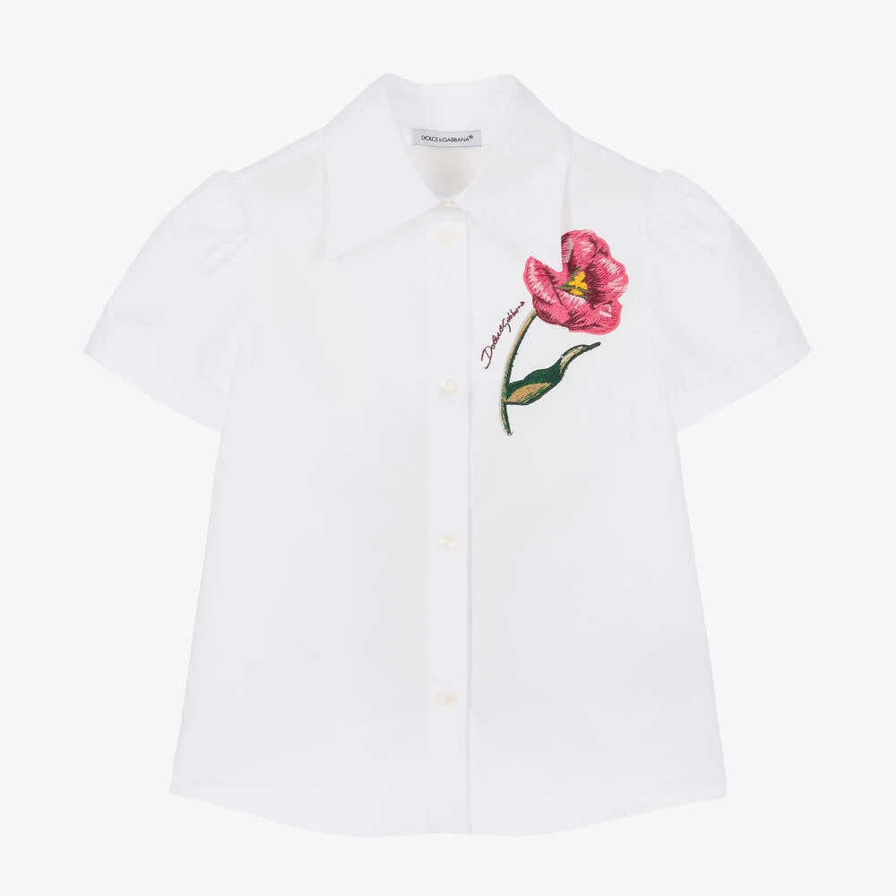 A pretty white blouse for girls by luxury Italian label Dolce & Gabbana, made in soft and lightweight cotton poplin. A beautiful pink flower is appliquéd on the chest, with logo embroidery adding a signature touch. This classic style has a smart pointed collar and short puffed sleeves, with branded buttons that fasten neatly on the front.