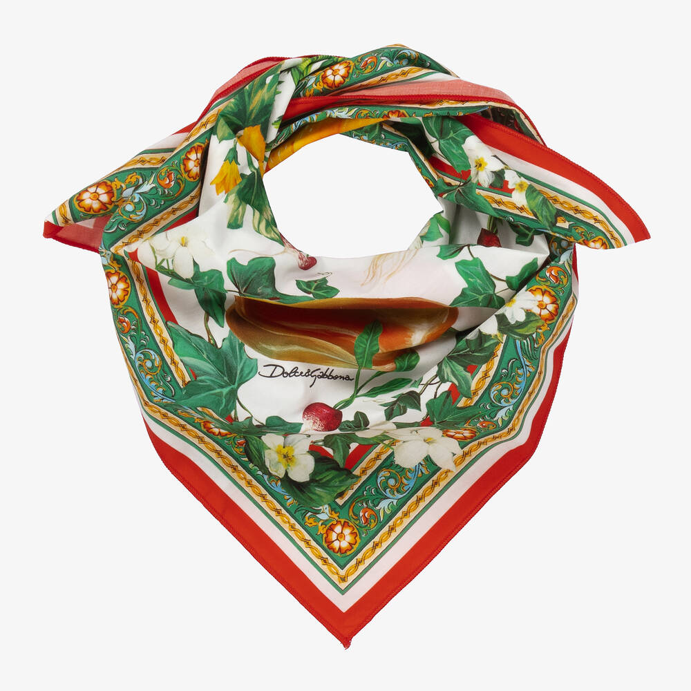 A beautiful white cotton poplin scarf for girls by luxury Italian designer Dolce & Gabbana, with contrast red, green and yellow borders. Inspired by the charming Sicilian garden, it has a vibrant all-over vegetable and blossom print. A delicate black logo script can be seen on one corner for a subtle designer finishing touch. This versatile scarf can also be worn around the neck, over the head on warm days or as a lovely accessory on a handbag.