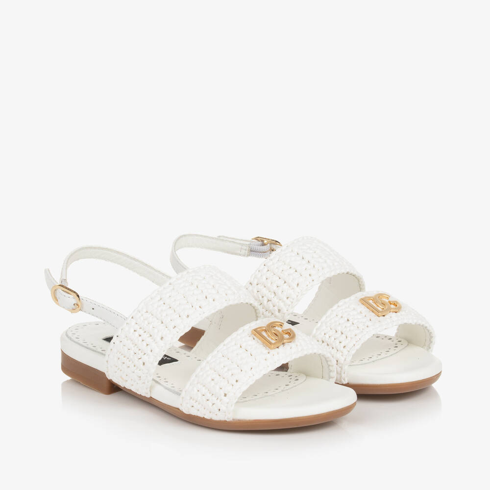 Chic and stylish, these white open-toe sandals for girls by luxury label Dolce & Gabbana, are made in the finest leather with raffia crochet detailing. There is a gold-tone DG logo on the front adding a distinctive designer look and to ensure a comfortable fit, they have an adjustable buckle-fastening ankle strap. They are lined in soft leather and have a lightly padded, perforated insole for lasting comfort. The slim, non-slip rubberised outer sole has a small heel and adds a sleek finish to this elegant design.
