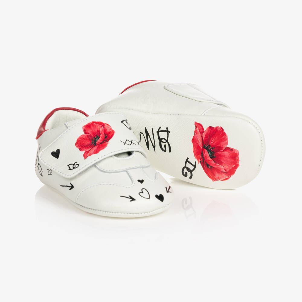 White leather pre-walker trainers for baby girls by luxury Italian brand Dolce & Gabbana. Super soft, with a flexible leather outer sole, they have black logo prints and pretty red poppy prints. There is a red trim on the heel and a velcro-fastening strap across the front for a secure fit.