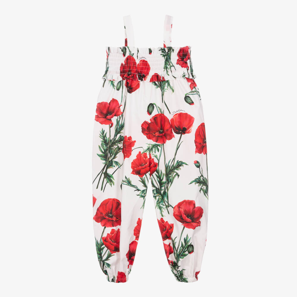 A gorgeous white jumpsuit for girls by Dolce & Gabbana, made in lightweight cotton poplin. Luxurious, fresh and modern, it is features a red poppy design, with a delicate script logo throughout for added designer flair. Effortless to style, it has a stretchy shirred bodice and elasticated hems.