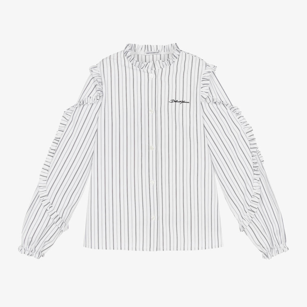 Beautiful white blouse for girls by luxury Italian fashion house, Dolce & Gabbana. Elegantly styled with a collarless neckline and cascading ruffles on the puffed sleeves, this smart piece is striped, simple and elegant. A script logo signs off the look, seen as a black embroidered logo on the chest. Ivory buttons, each embossed with designer detailing, simply fasten the blouse.